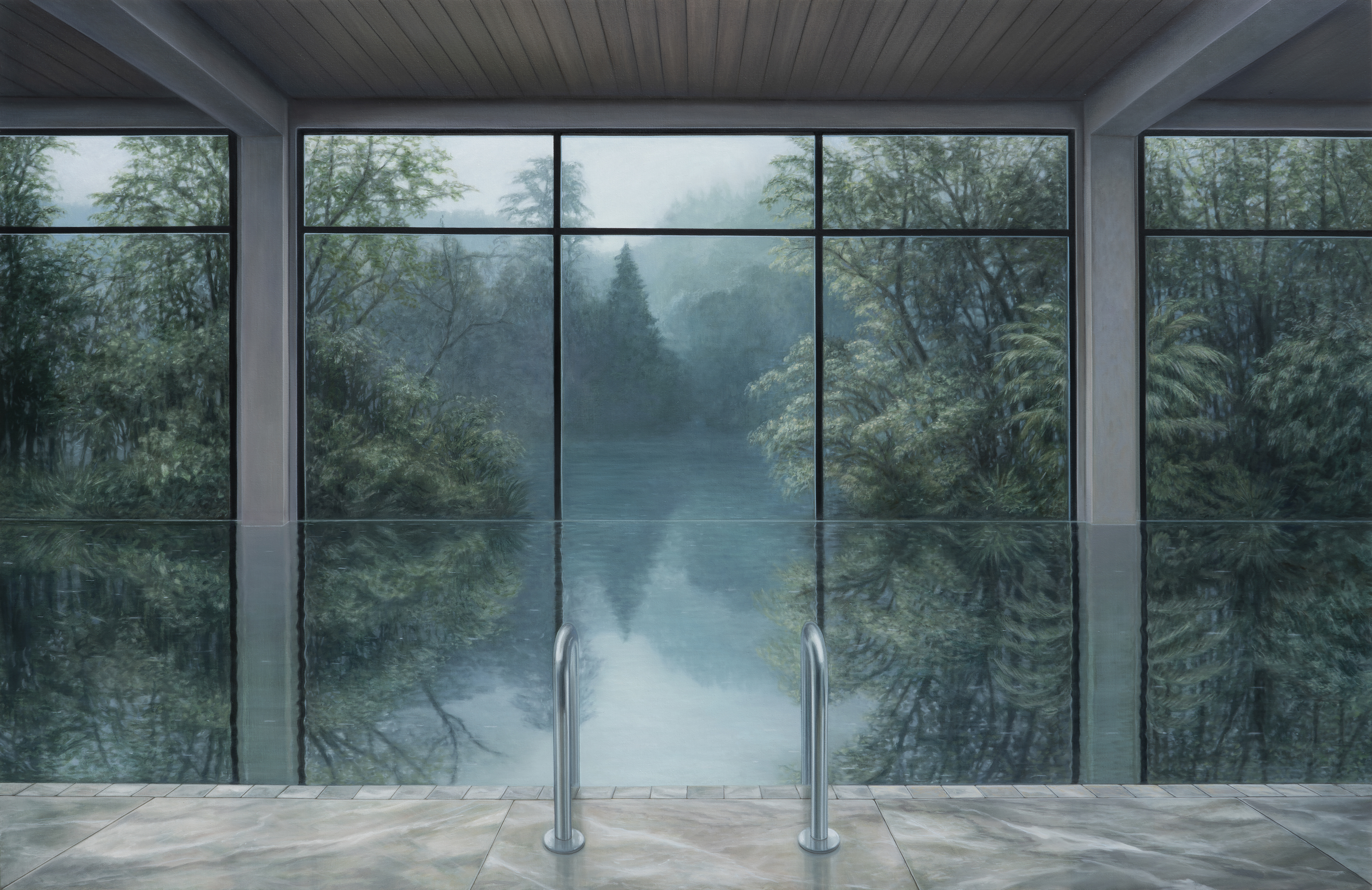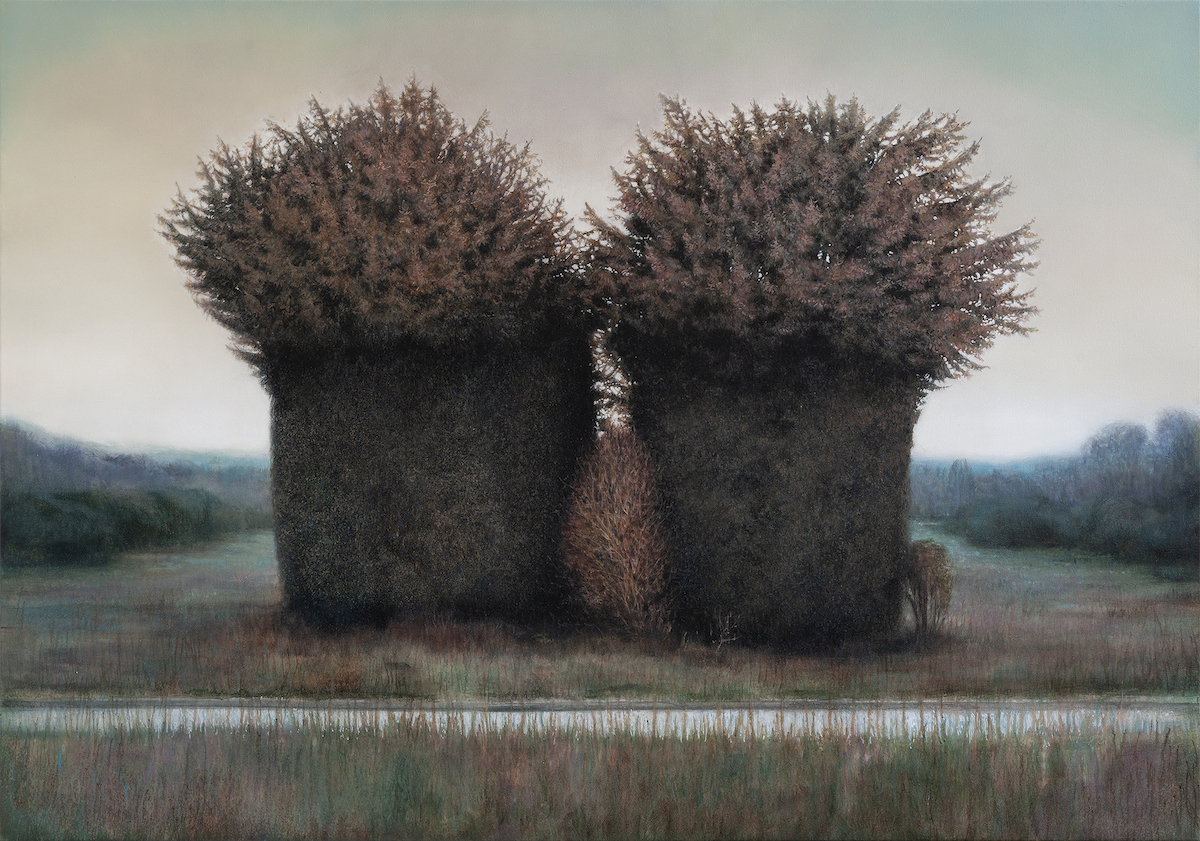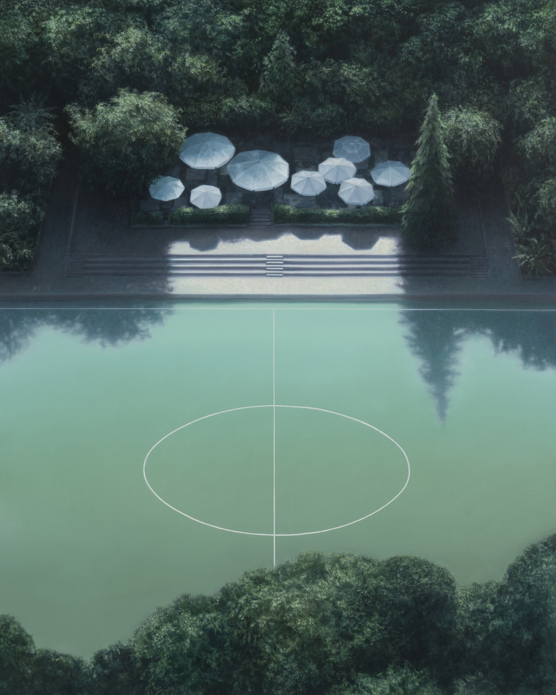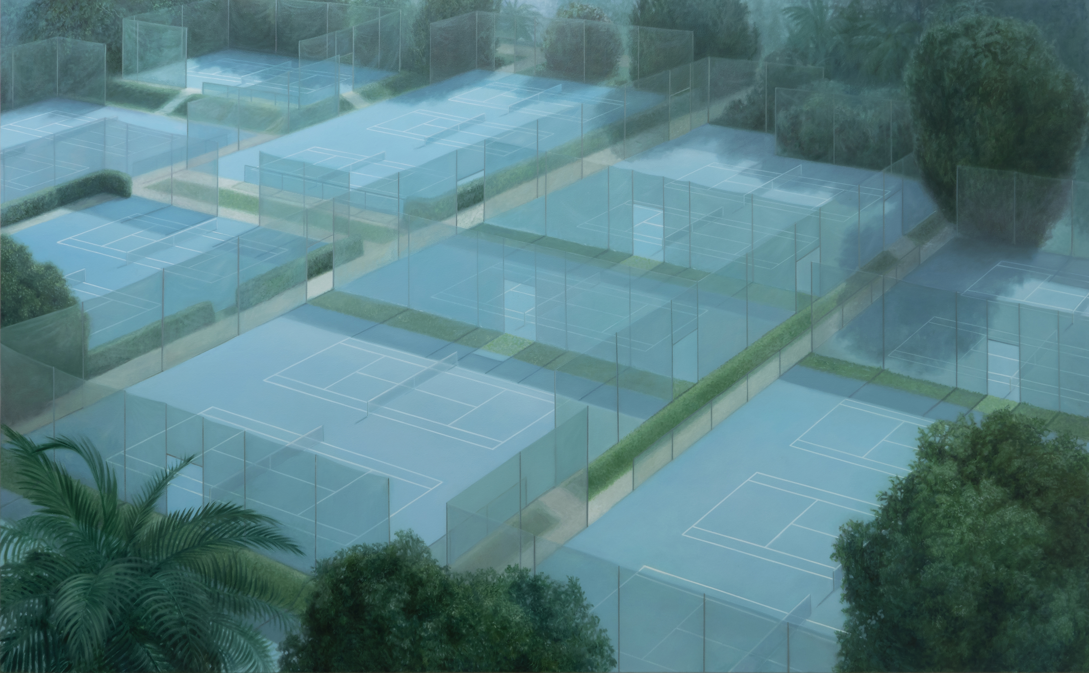 Human and nature meet in the works of Melanie Siegel in a constructed lifeworld. In her examination of real places and landscapes, the painter creates fictitious and idealized landscapes. The subjects undergo numerous transformations in preliminary studies and during the actual painting process on the canvas. The pictorial spaces themselves, which are reminiscent of clinical model landscapes, are just as constructed as the man-made landscape. Apparent calm and harmony permeate the deserted sceneries. However, the stagings are characterized by a subtly ambivalent atmosphere. On the threshold between utopia and dystopia, the allegories tell of the contrast between longing for nature and human intervention in the environment. The depicted motifs usually appear from a bird's eye view. This supposedly objective perspective is clearly structured and creates both a supposed distance and a certain anonymity between the viewer and the place. The connection is restored through a familiar motif, such as idyllically placed tennis courts. Nevertheless, the scene appears surreal, as the motifs defy the familiar view of these places.