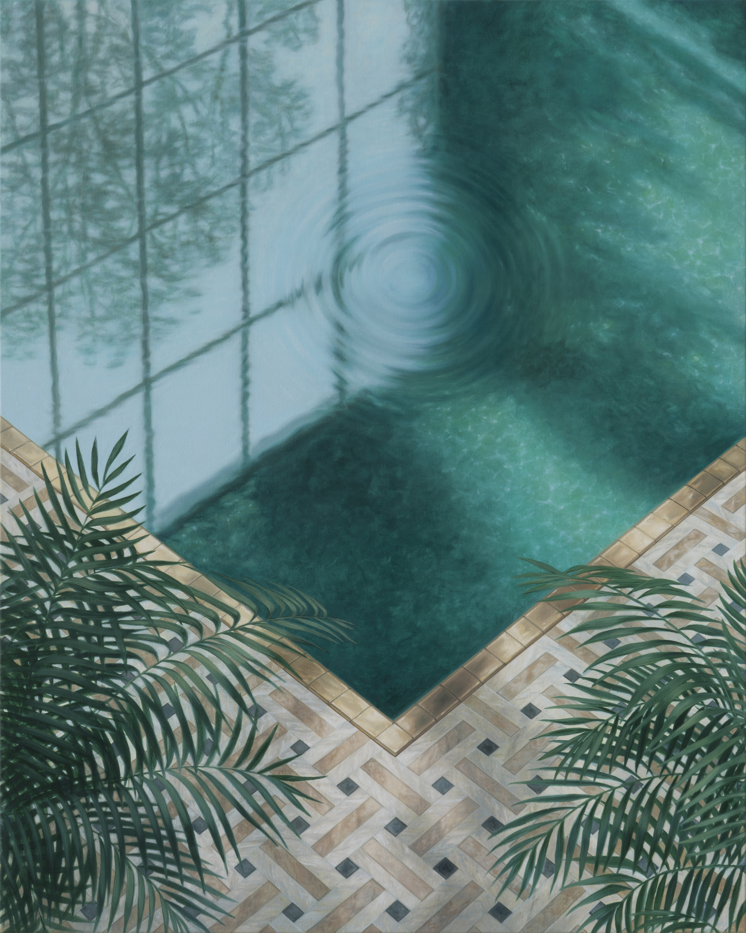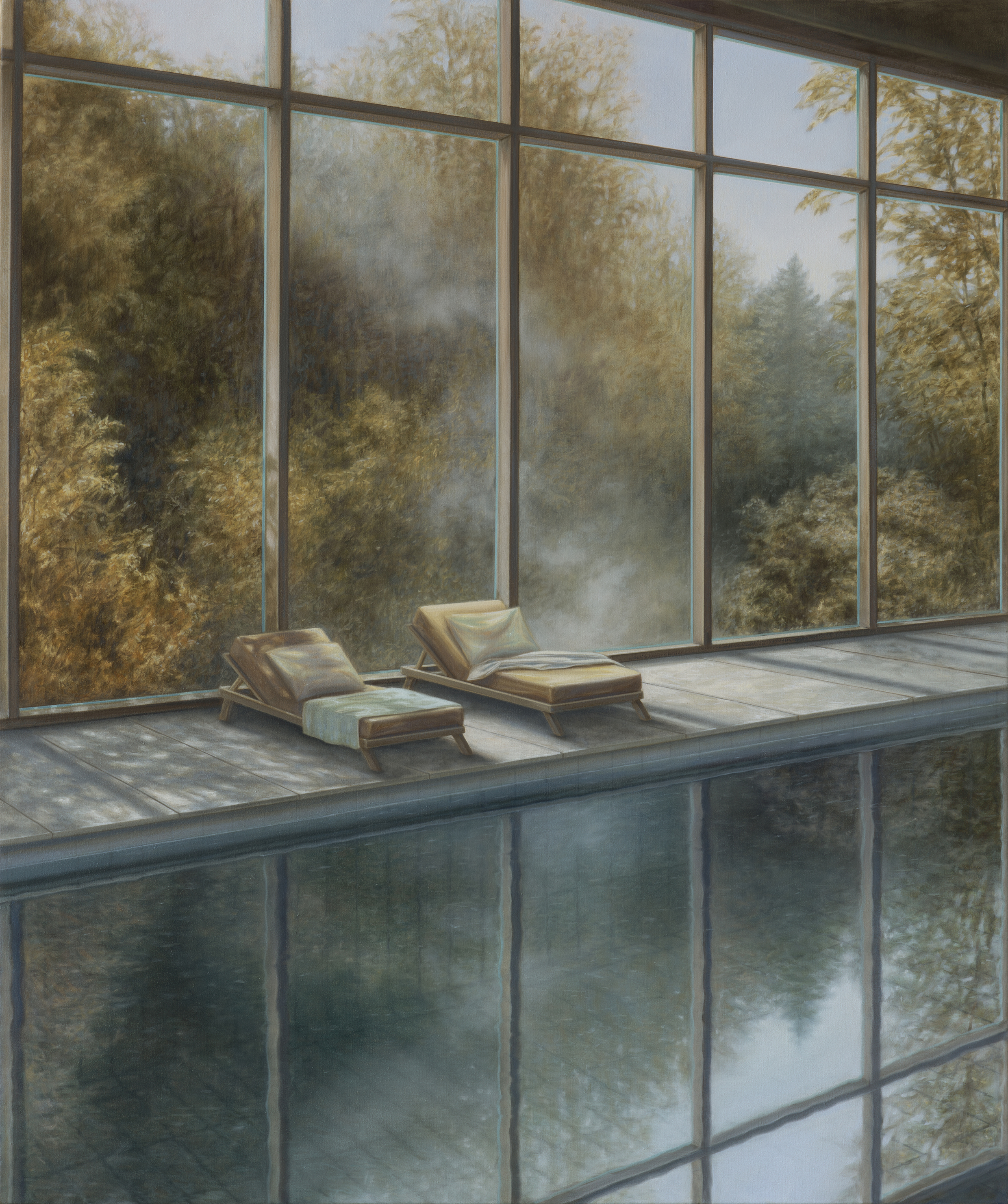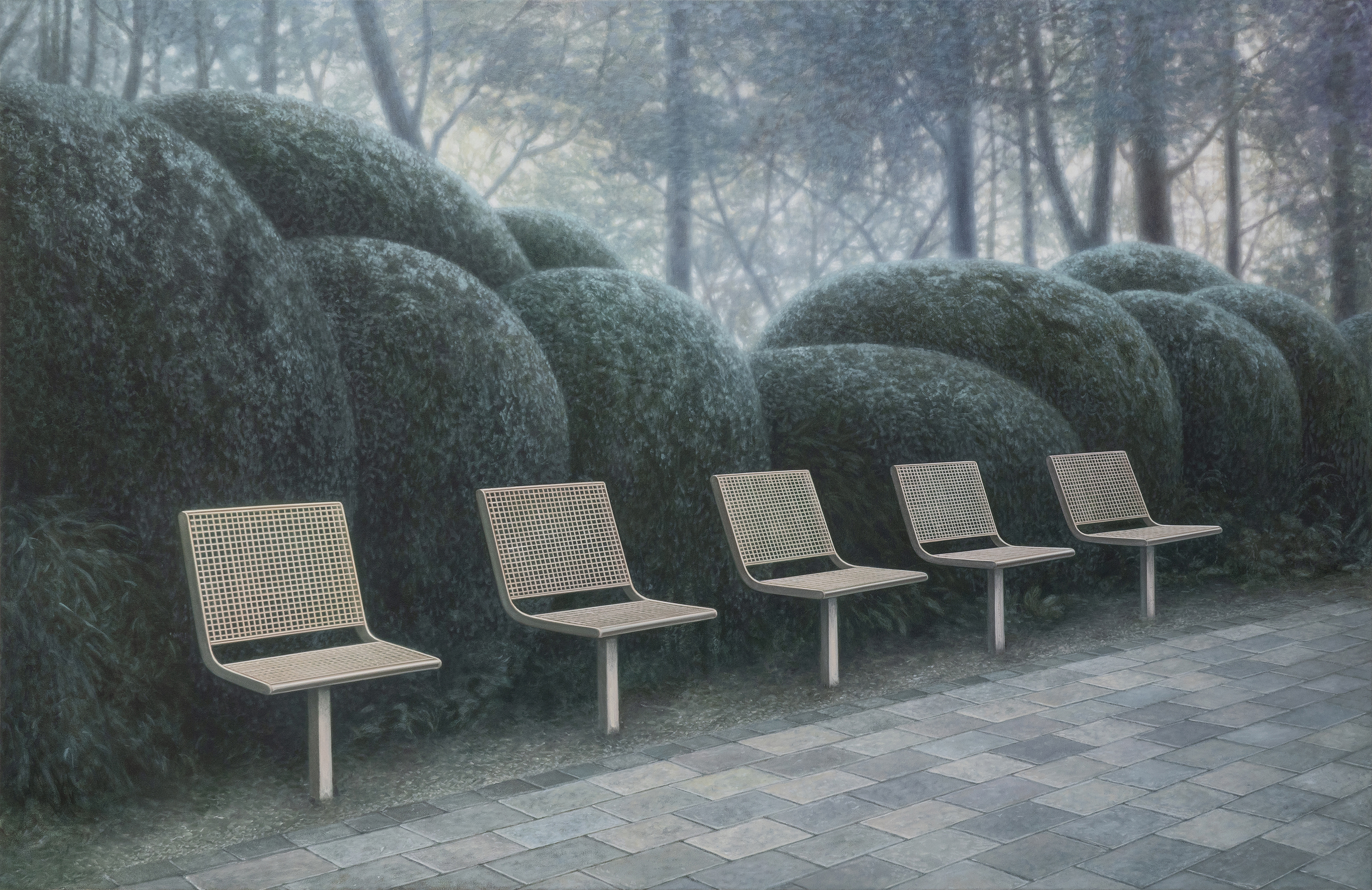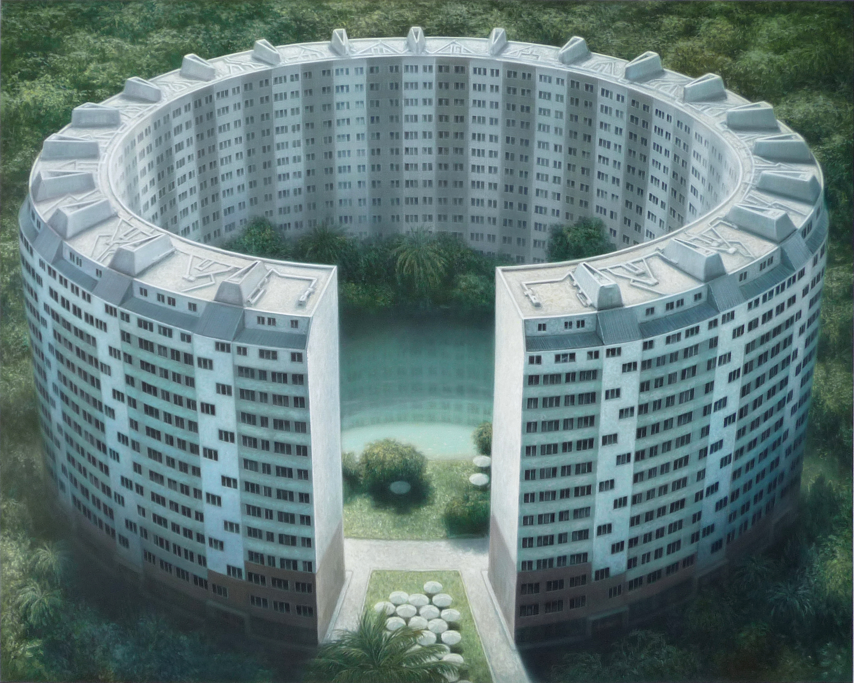 Human and nature meet in the works of Melanie Siegel in a constructed lifeworld. In her examination of real places and landscapes, the painter creates fictitious and idealized landscapes. The subjects undergo numerous transformations in preliminary studies and during the actual painting process on the canvas. The pictorial spaces themselves, which are reminiscent of clinical model landscapes, are just as constructed as the man-made landscape. Apparent calm and harmony permeate the deserted sceneries. However, the stagings are characterized by a subtly ambivalent atmosphere. On the threshold between utopia and dystopia, the allegories tell of the contrast between longing for nature and human intervention in the environment. The depicted motifs usually appear from a bird's eye view. This supposedly objective perspective is clearly structured and creates both a supposed distance and a certain anonymity between the viewer and the place. The connection is restored through a familiar motif, such as idyllically placed tennis courts. Nevertheless, the scene appears surreal, as the motifs defy the familiar view of these places.