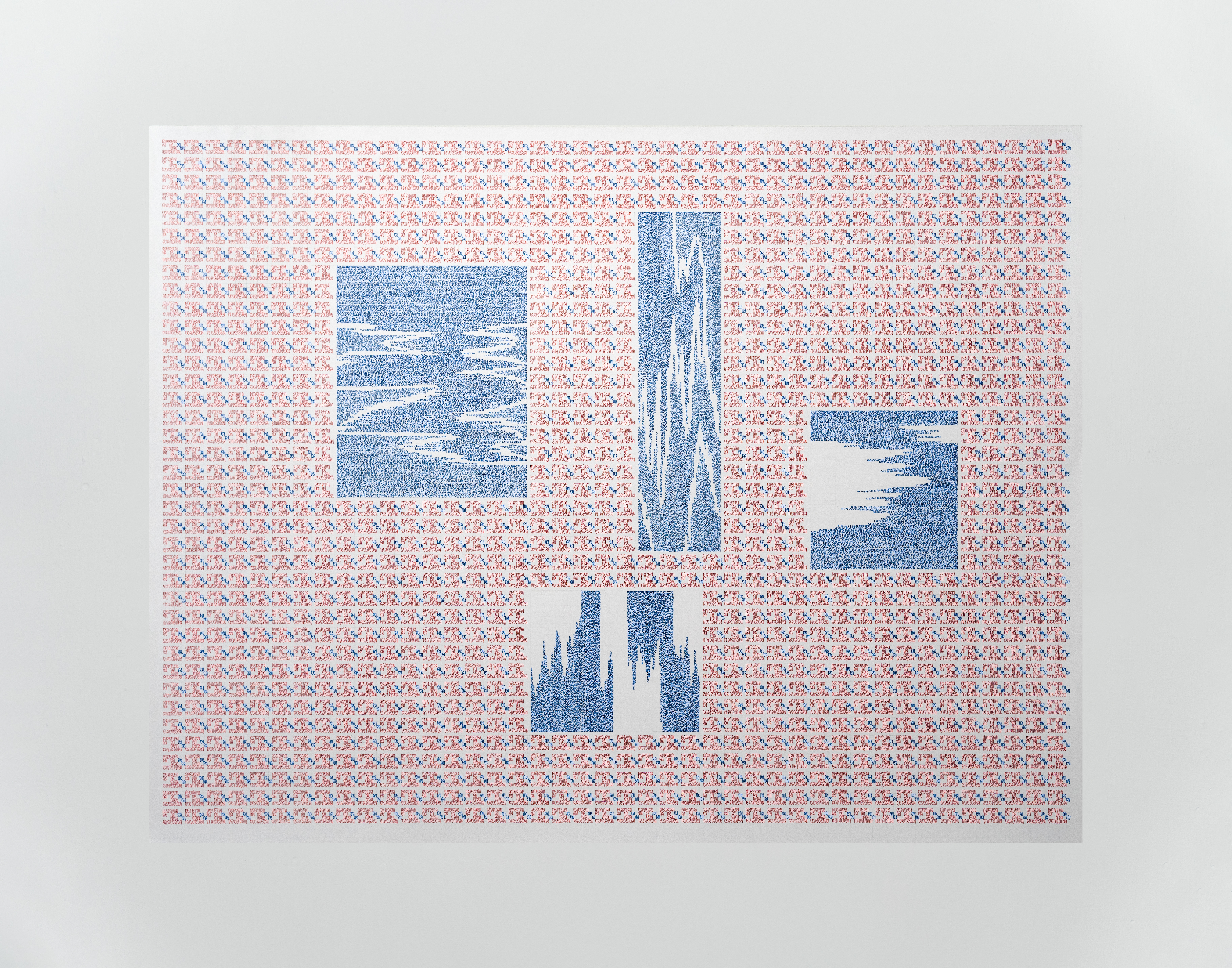 Vera Matos' images use columns of text that make direct reference to the Spanish language and language more broadly as instruments of domination and control. The geometric elements and patterns found throughout pre-Columbian iconography visually affect these columns. They represent the forced imposition of a new way of thinking, while the use of tiered and trapezoidal pre-Columbian patterns found in Incan tocapus, Tiwanaku pottery, and Paracas textiles serve to manifest rejection and opposition to Spanish culture.