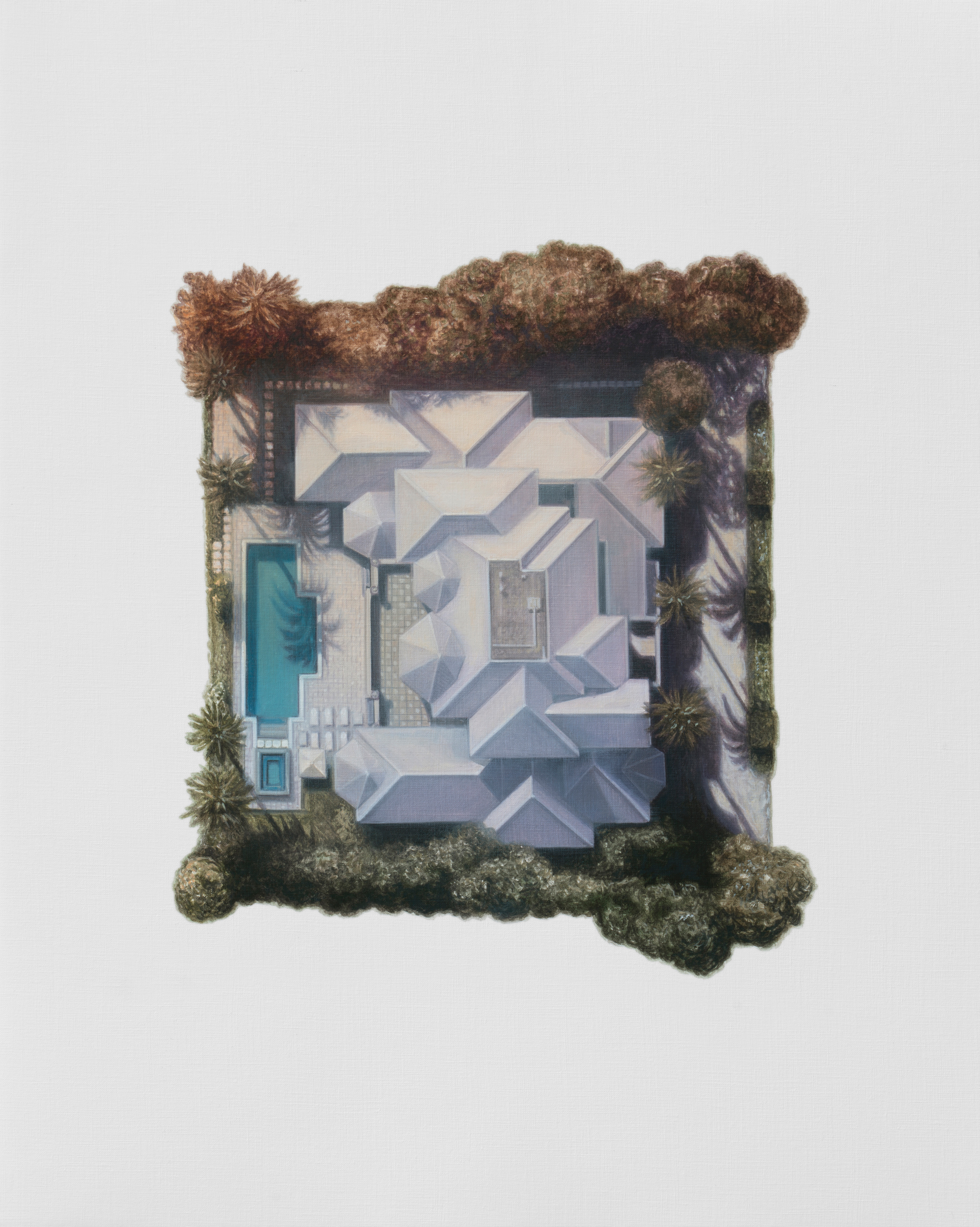The works, characterized by aerial perspectives and geometric compositions, evoke a detached and abstracted view of leisure spaces. The exhibition is accompanied by small natural palm plants placed in vases, serving as a comment on humanity’s attempt to control nature determining where it is allowed to grow and where it is not. These imagined “lifeworlds” subtly address environmental concerns, examining how humanity shapes its surroundings and how nature adapts to or resists these interventions. The result is a reflection of reality that carries the allure of recognition. Familiarity is established through subject matter, spatial composition, and painterly technique, creating scenes that initially appear credible and orderly. Yet after this first visual attraction, a sense of uncertainty emerges: the scenery takes on an unreal quality, and the subject begins to withdraw. This shift invites reflection on the relationship between humans and the realities they construct for themselves. While the paintings may appear strikingly realistic at first glance, they ultimately question the very nature of reality.
