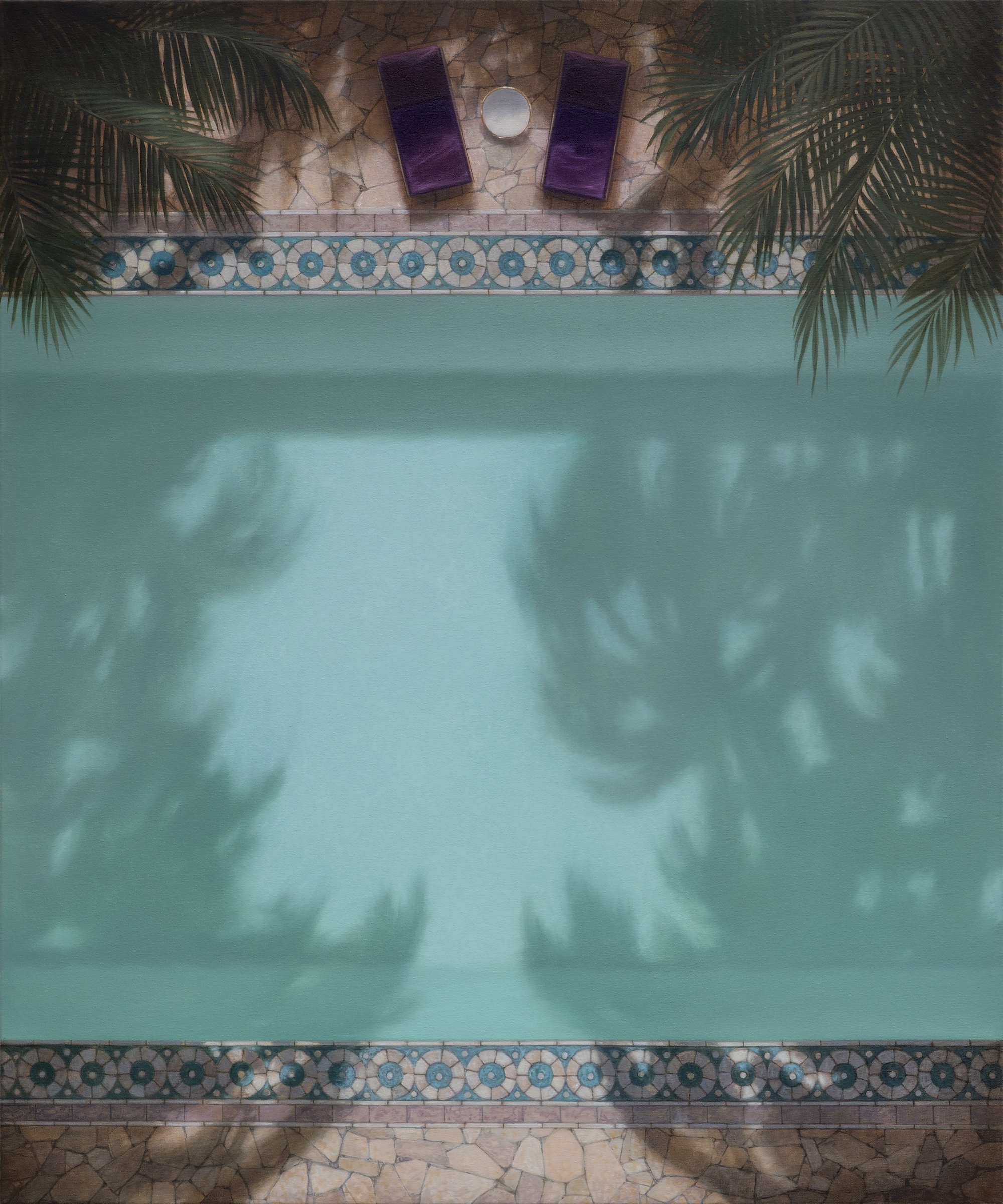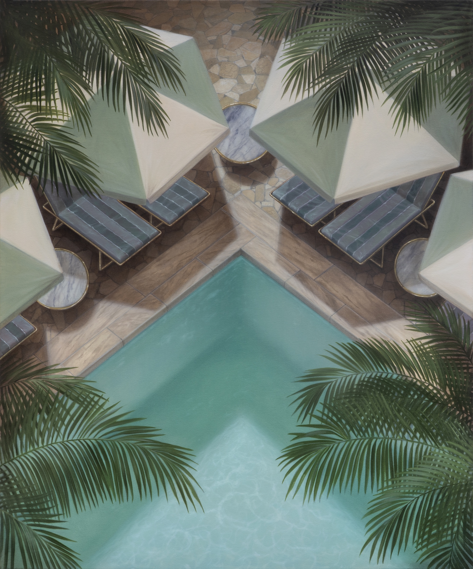 The first solo exhibition of Melanie Siegel in the historic district of Tribeca, New York, presents a body of work that continues the artist’s practice, which explores the interplay between natural and artificial environments and the tension between utopia and dystopia. Her paintings depict geometrically precise, uninhabited scenes such as swimming pools, tennis courts, and residential spaces iconic symbols of leisure and artificial paradise. These imagined spaces, devoid of narrative specificity, invite viewers to project their own interpretations, prompting reflection on humanity’s relationship with constructed realities.
