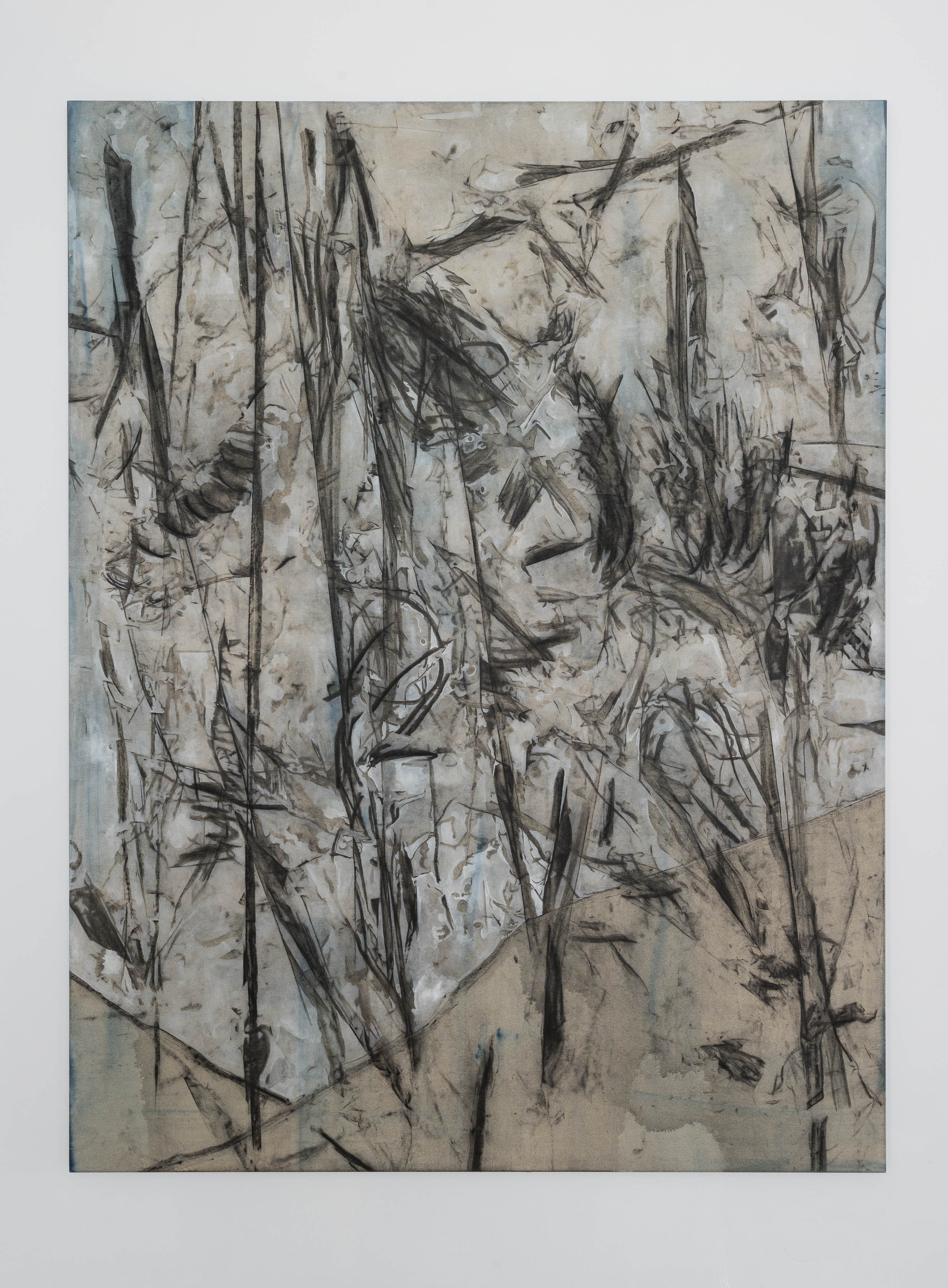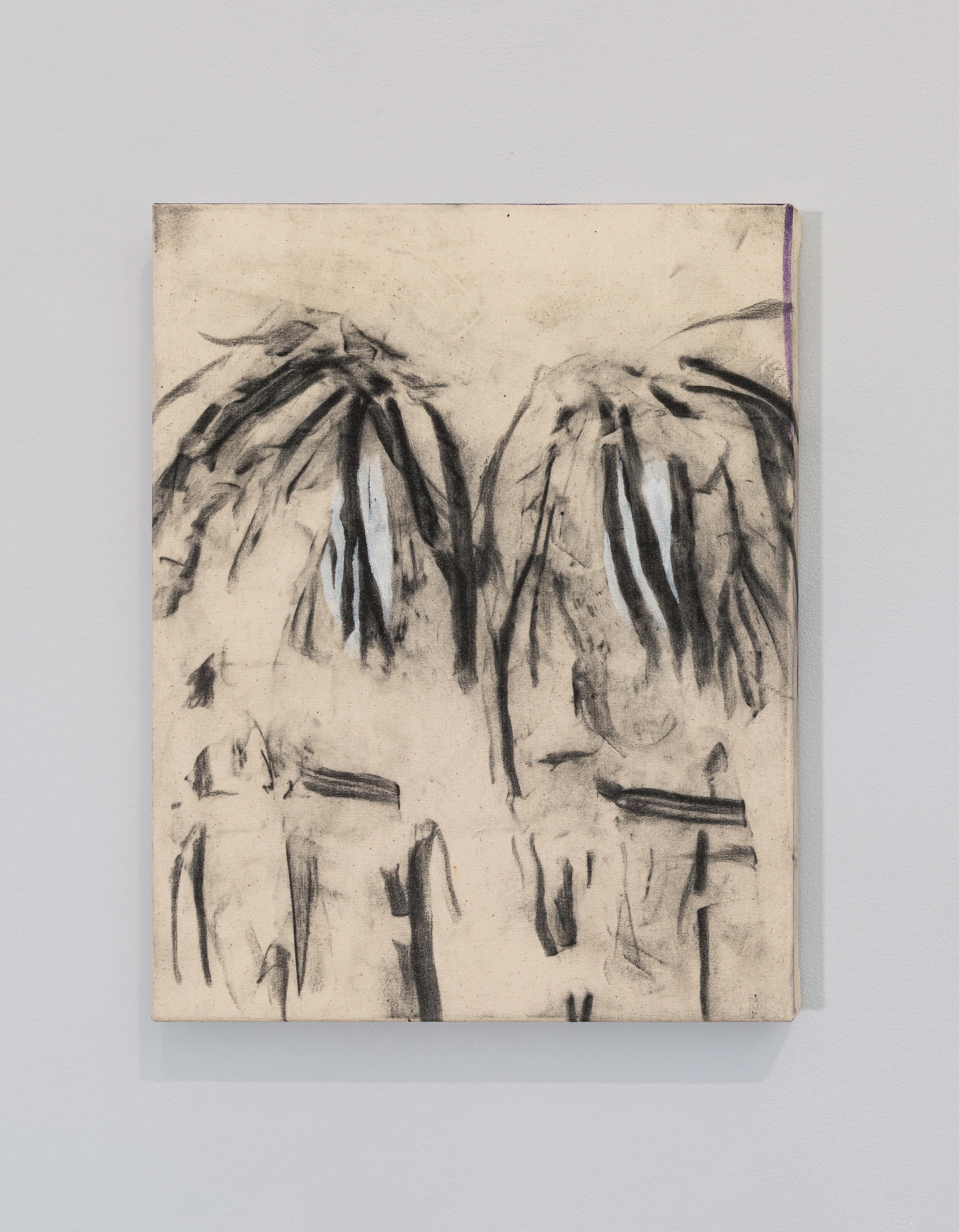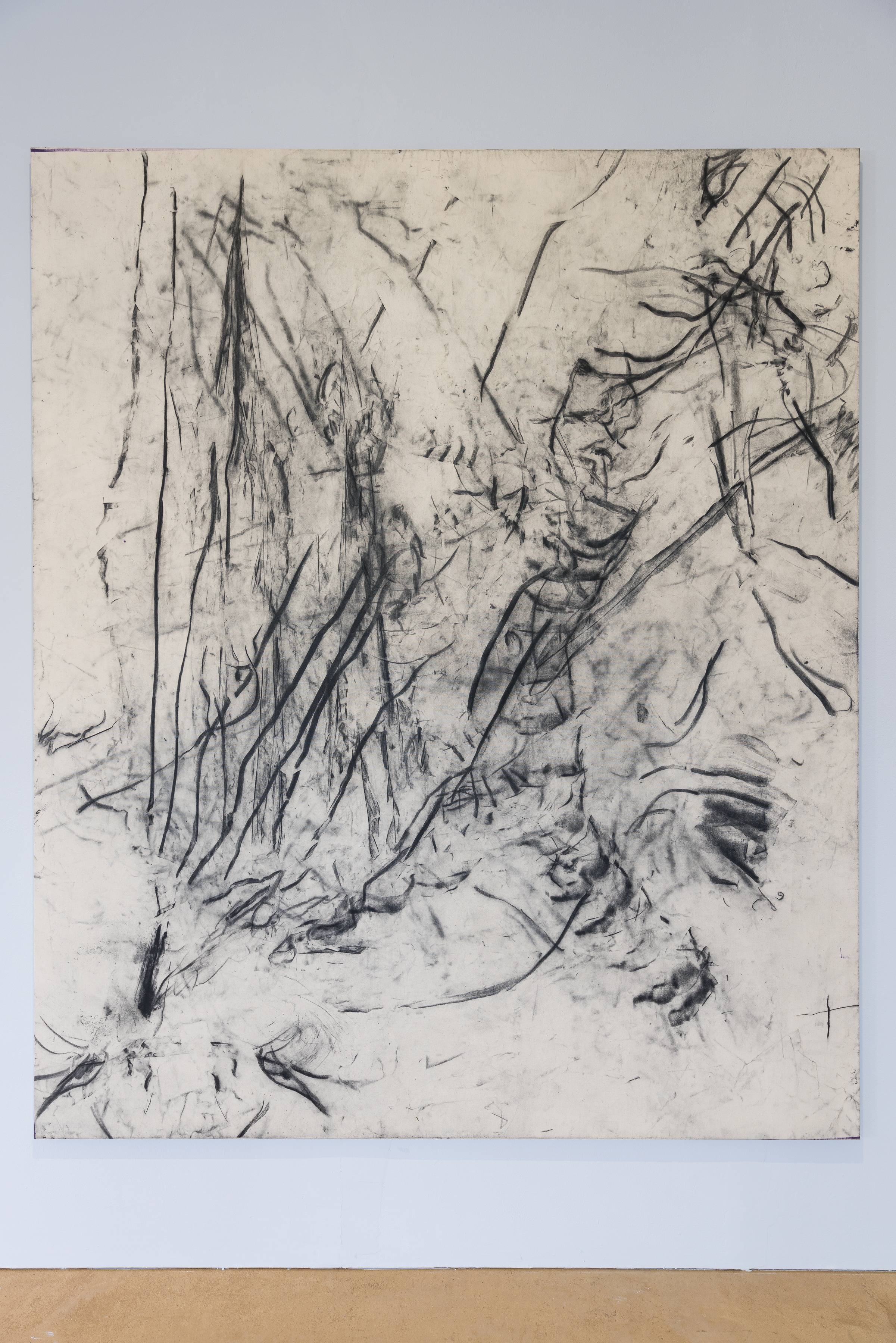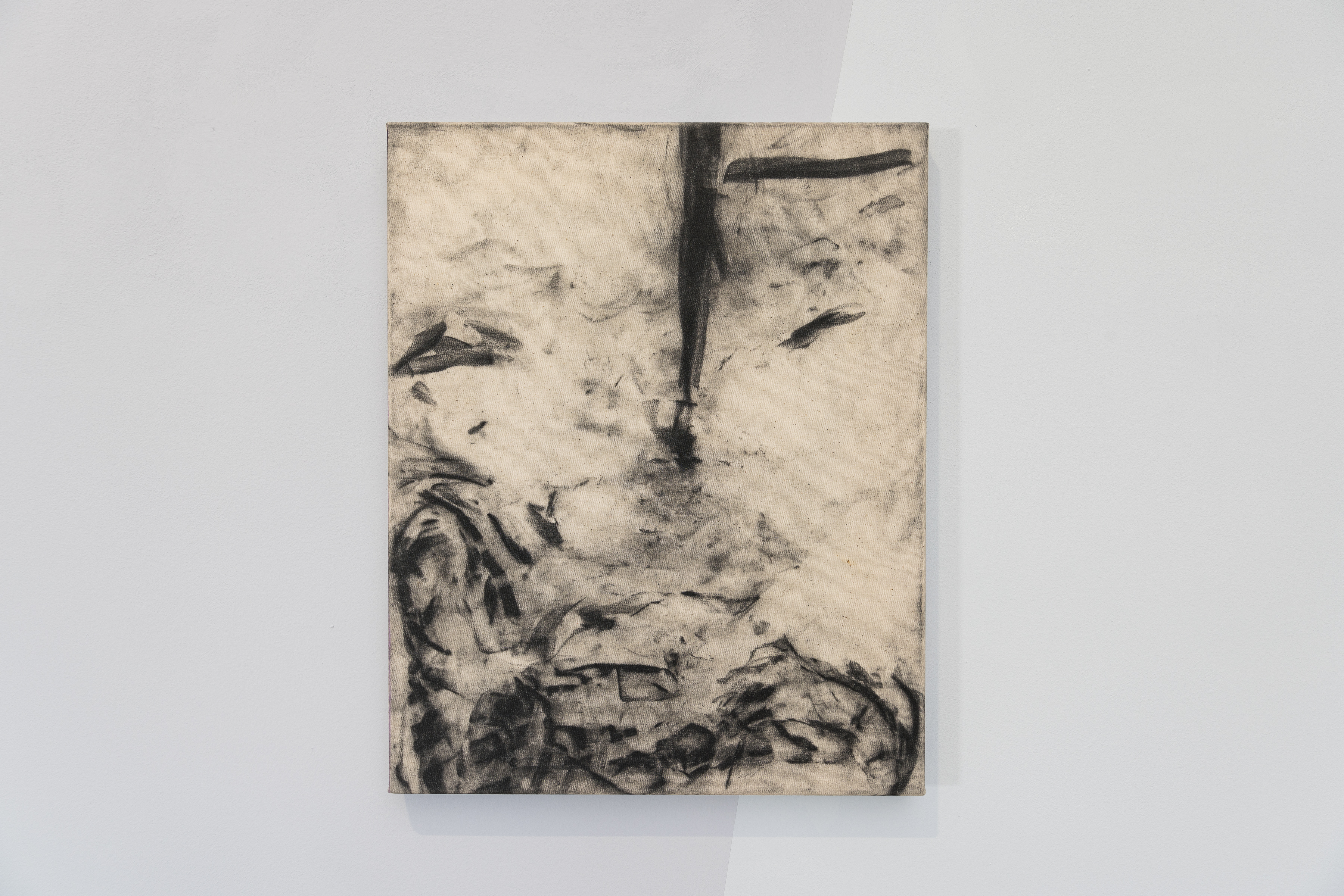 The artist paints objects from his studio with charcoal and wraps them in a yet-to-be-stretched canvas. The traces left by the object serve as the inspirational starting point for his compositions.