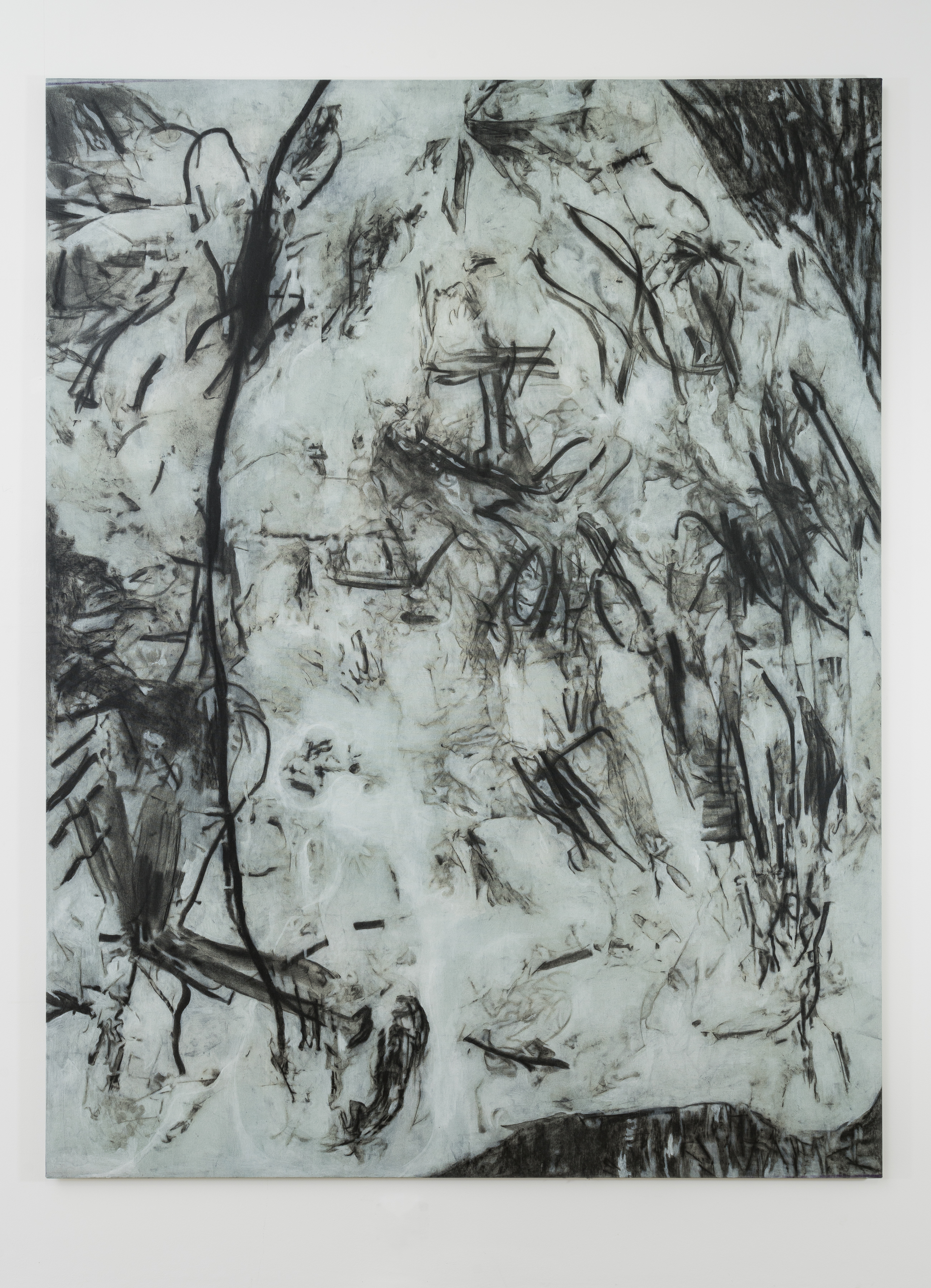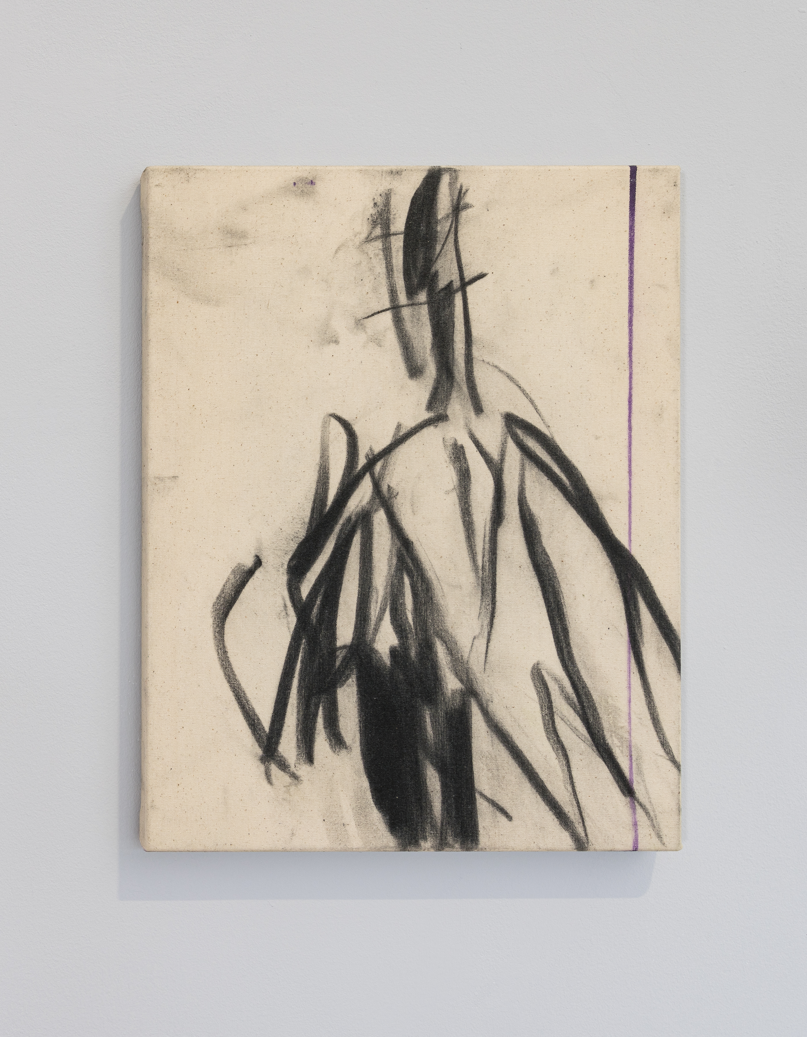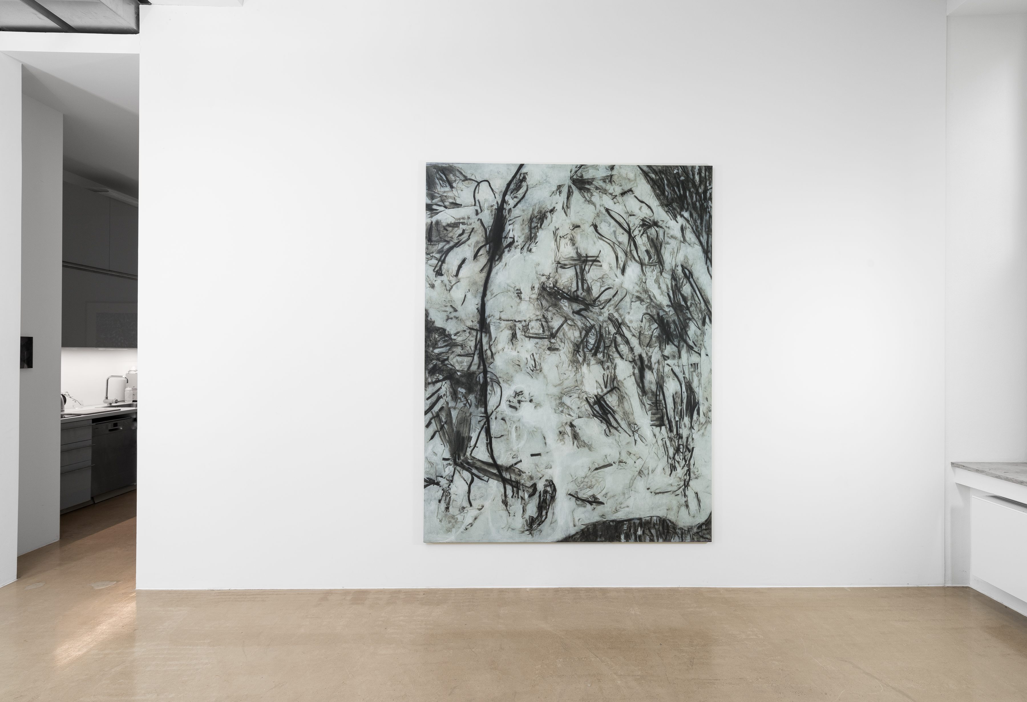 The artist paints objects from his studio with charcoal and wraps them in a yet-to-be-stretched canvas. The traces left by the object serve as the inspirational starting point for his compositions.