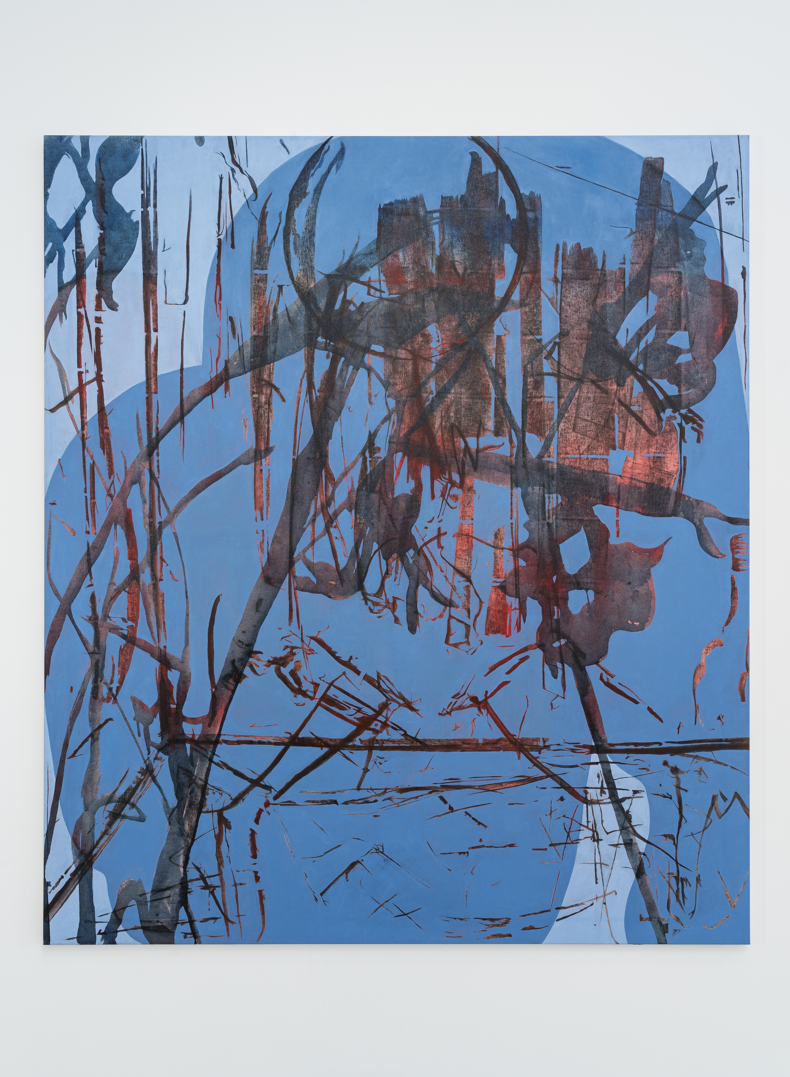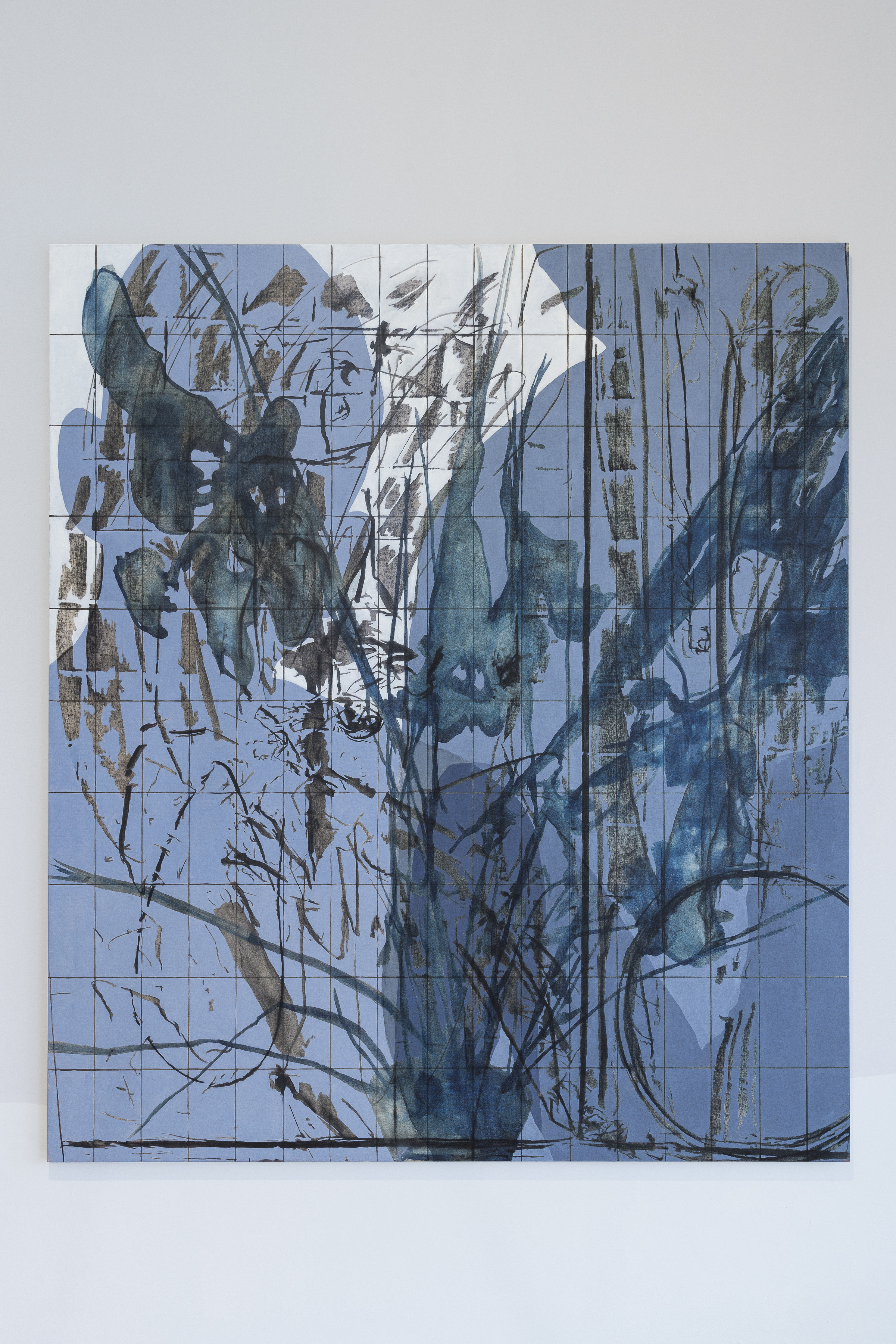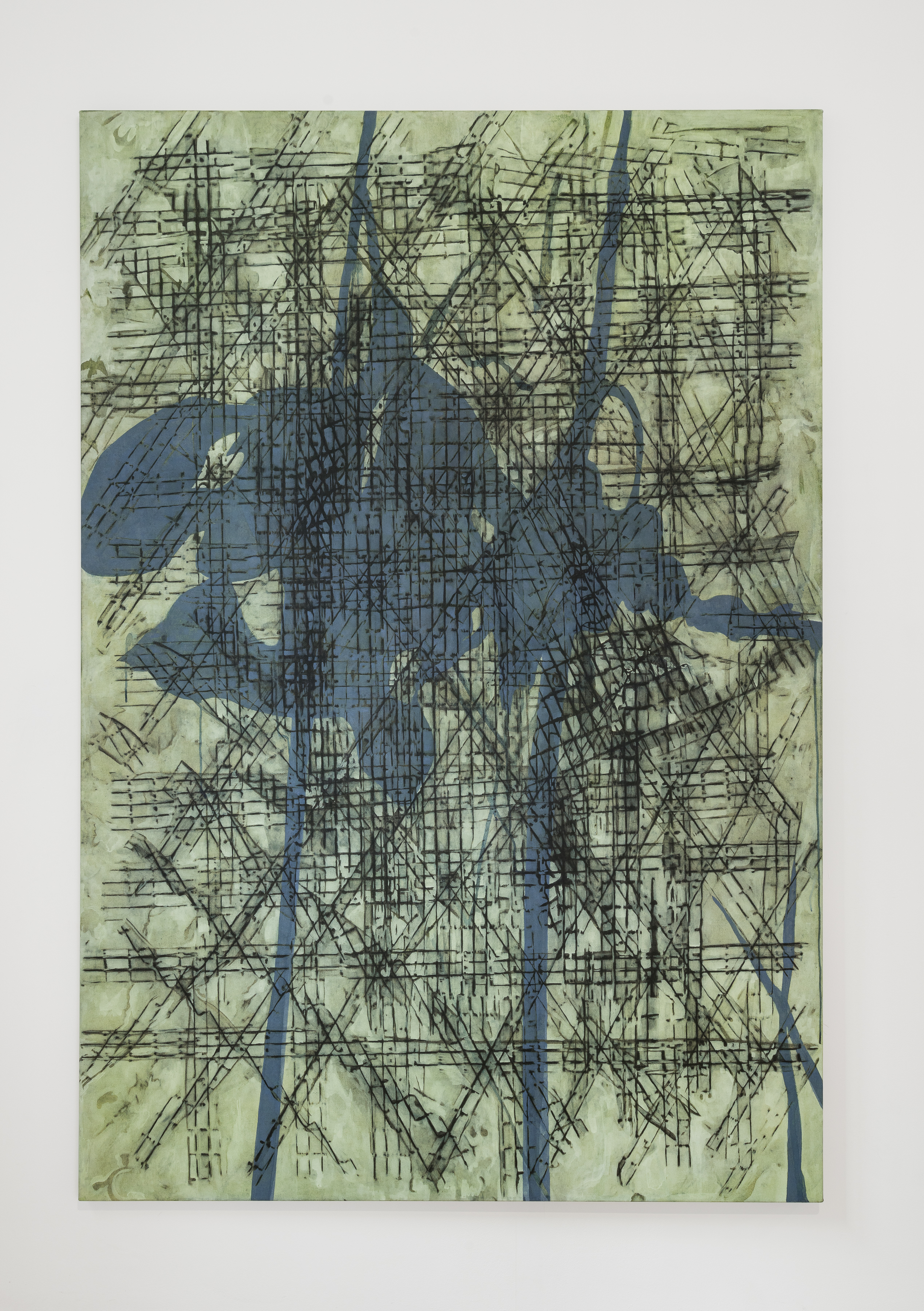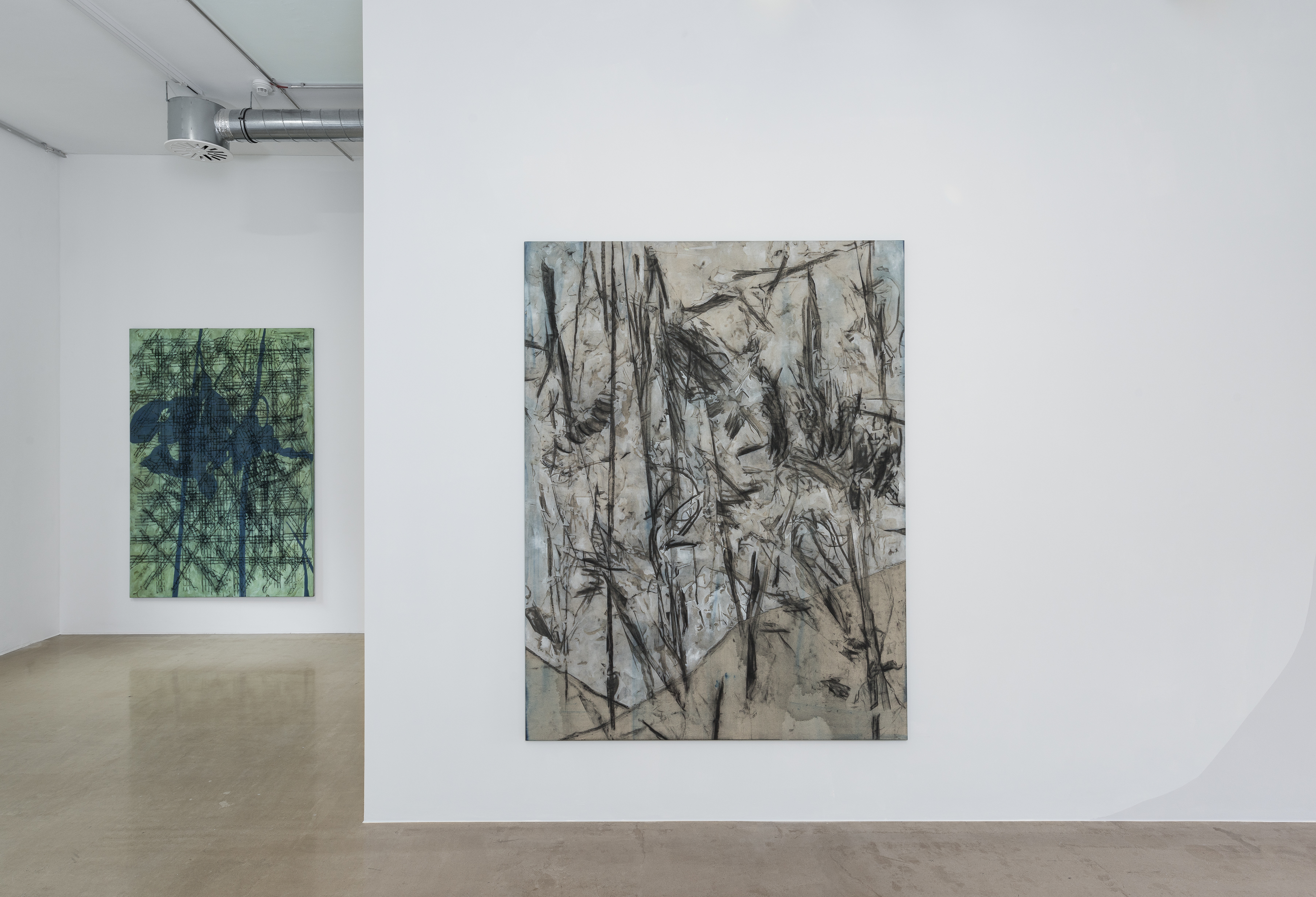 The artist paints objects from his studio with charcoal and wraps them in a yet-to-be-stretched canvas. The traces left by the object serve as the inspirational starting point for his compositions.