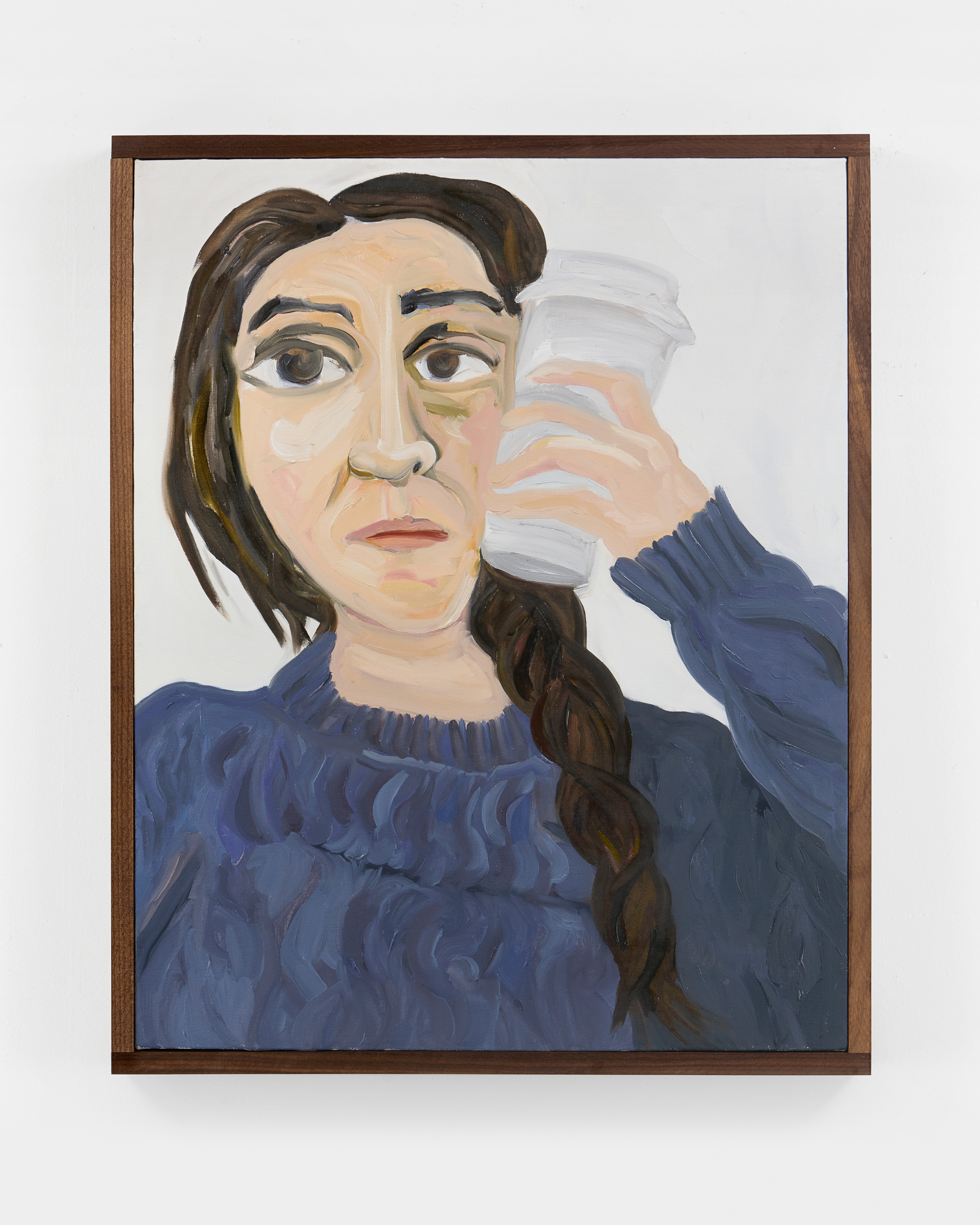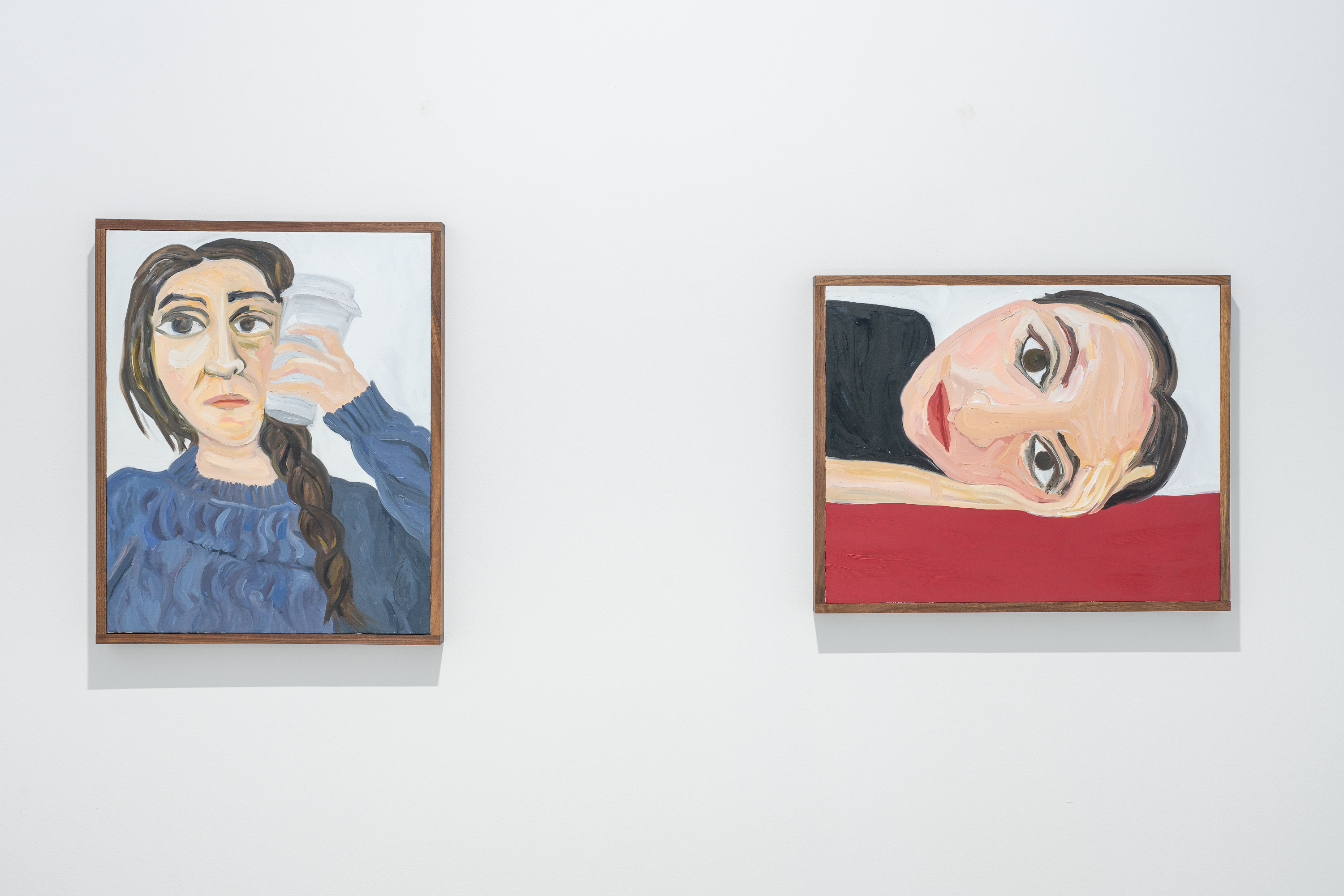 Phoebe Derlee presents emotionally charged self-portraits painted with bold, expressive brushstrokes. Her figures, often placed against vivid monochrome backgrounds, hover between familiarity and estrangement. Her work explores the malleability of the human body, dissolving the line between strength and vulnerability.
