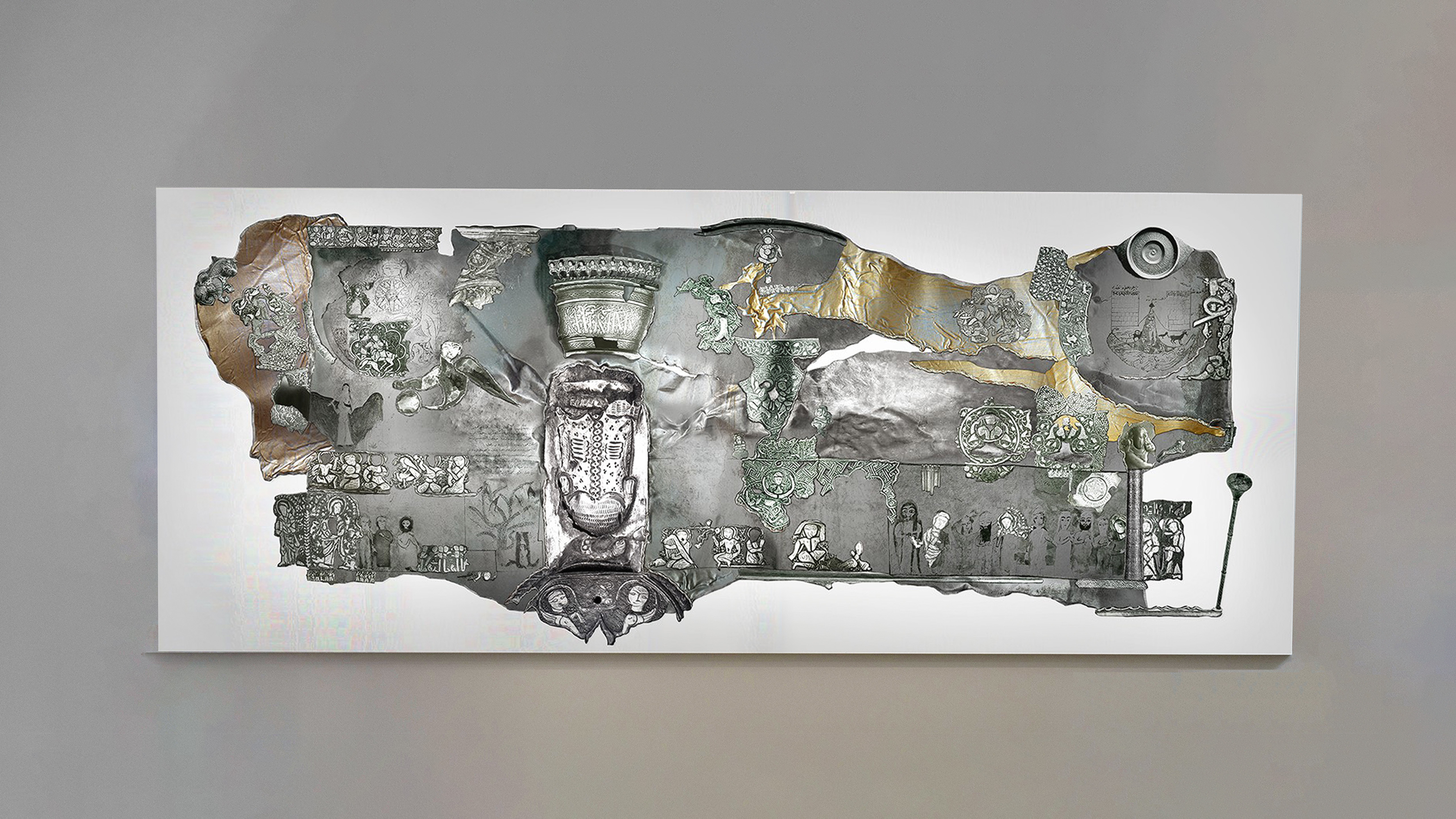 The exhibition draws on the almost forgotten photo and document archive of David Storm Rice (1913-1962), a researcher of medieval metal vessels, and incorporates the precious objects that were manufactured in the Middle East, traded in the Levant, brought to Europe via Venice, and now mostly displayed in western museums. Through digital craftwork, Azoulay disassembles objects photographed by Rice, then digitally "soldiers" and "inlays" them anew on metal panels, transfiguring their gender in the process. The resulting cartographies display voids, displacements, and replacements in the geographies of knowledge.