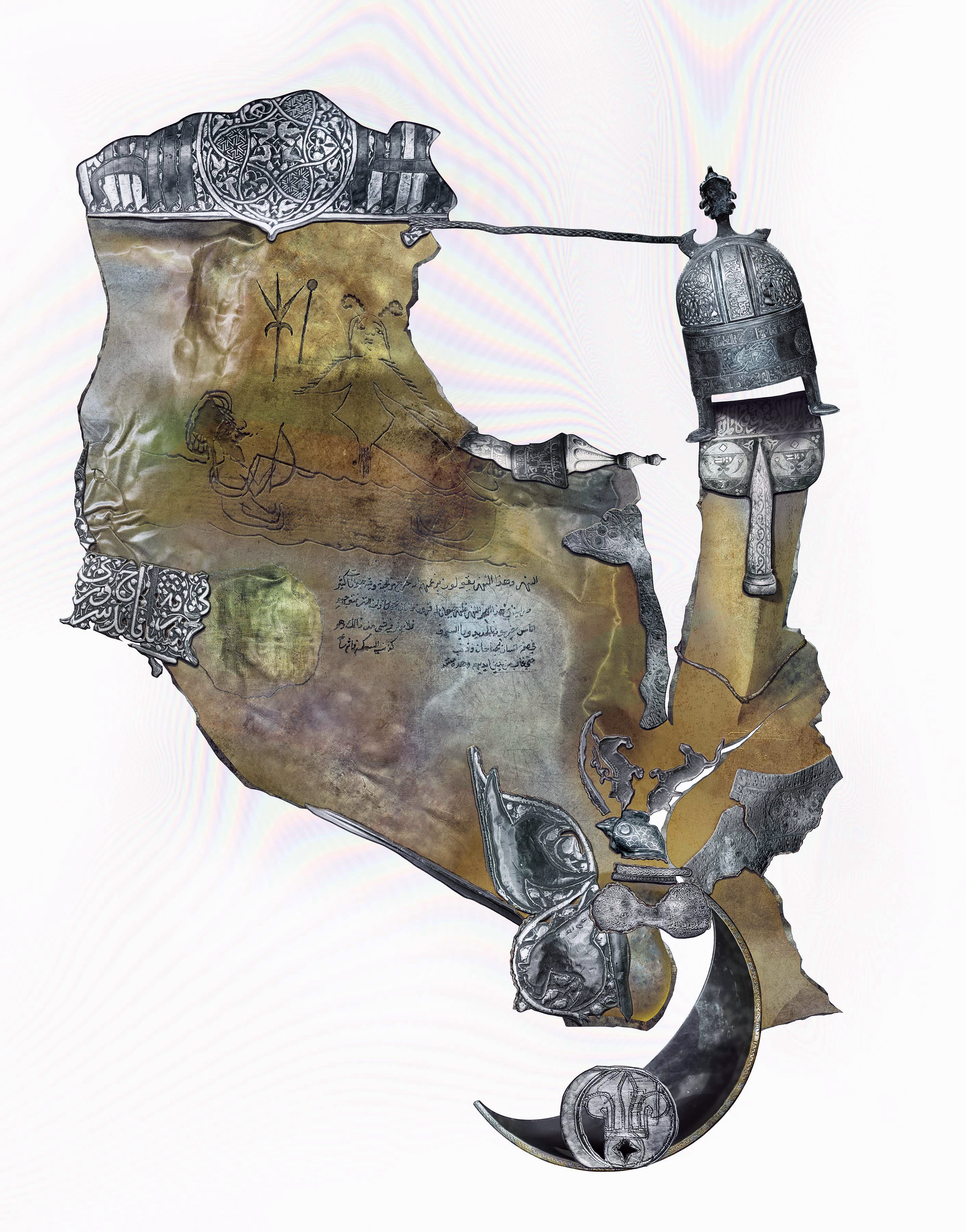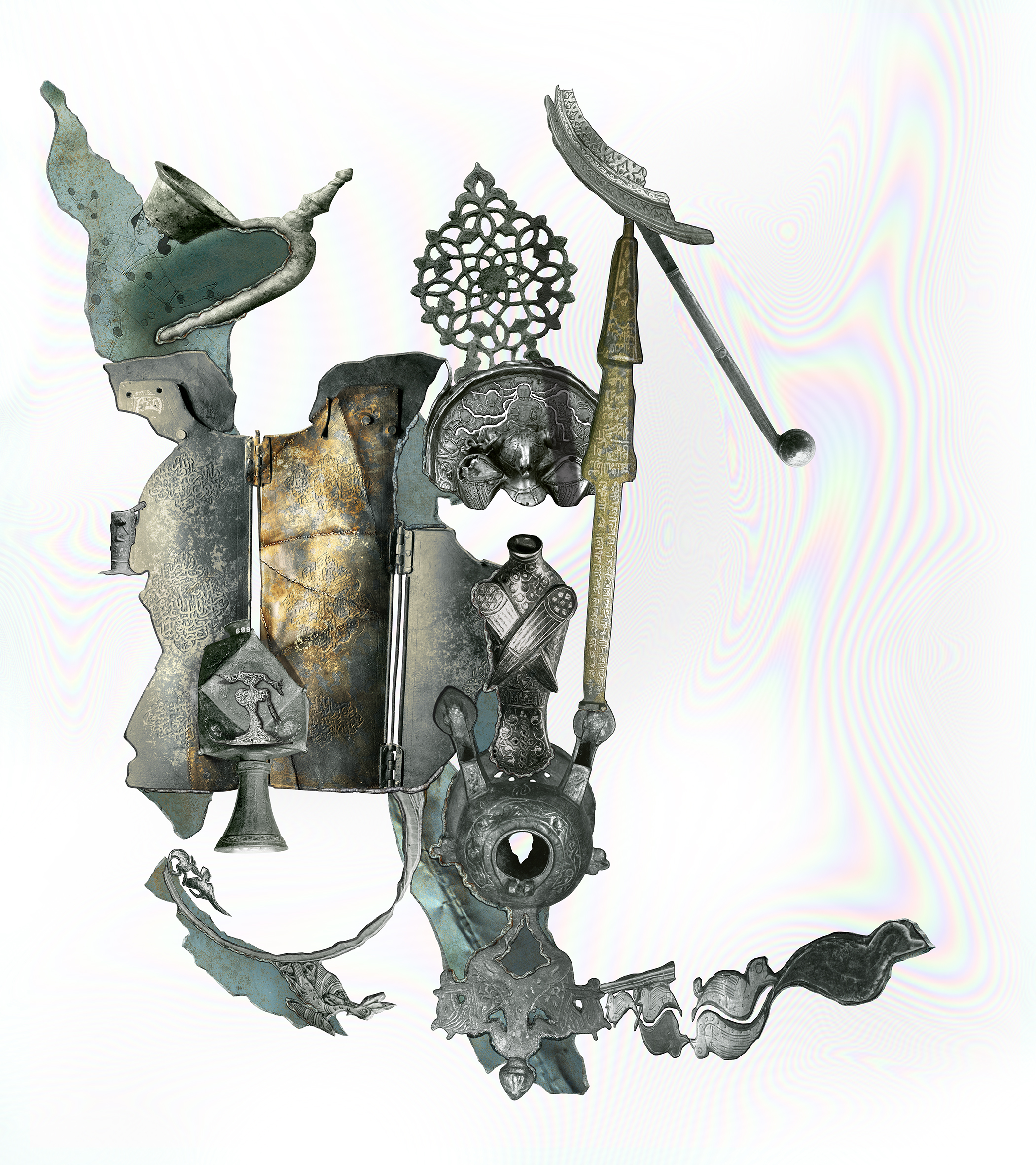 Die Ausstellung greift auf das fast vergessene Foto- und Dokumentenarchiv von David Storm Rice (1913-1962) zurück, einem Forscher mittelalterlicher Metallgefäße, und integriert die wertvollen Objekte, die im Nahen Osten hergestellt, im Levante-Raum gehandelt, über Venedig nach Europa gebracht und heute meist in westlichen Museen ausgestellt werden. Durch digitale Handwerkskunst zerlegt Azoulay die von Rice fotografierten Objekte und „lötet“ und „legt“ sie dann digital neu auf Metallplatten ein, wodurch ihr Geschlecht im Prozess transfiguriert wird. Die resultierenden Kartographien zeigen Leerräume, Verschiebungen und Ersetzungen in den Geografien des Wissens.